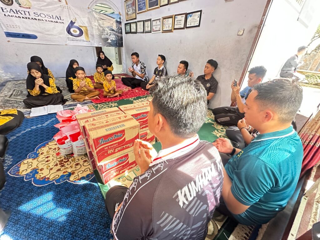 TARAKAN – Kepala Lembaga Pemasyarakatan (Lapas) Kelas IIA Tarakan, Jupri, didampingi jajaran pejabat struktural dan staff beserta pengurus Paguyuban Ibu-Ibu Pemasyarakatan (PIPAS), menyerahkan bantuan sosial (Bansos) berupa paket sembako kepada Yayasan Berkah Ar-Rahim Kota Tarakan, Senin (14/04).